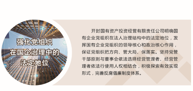 開封國投在市委市政府、市財政局的正確領(lǐng)導(dǎo)下,充分發(fā)揮領(lǐng)導(dǎo)作用,把方向、管大局、保落實,依照規(guī)定討論和決定公司重大事項。以促進公司經(jīng)營發(fā)展為中心,不斷加...