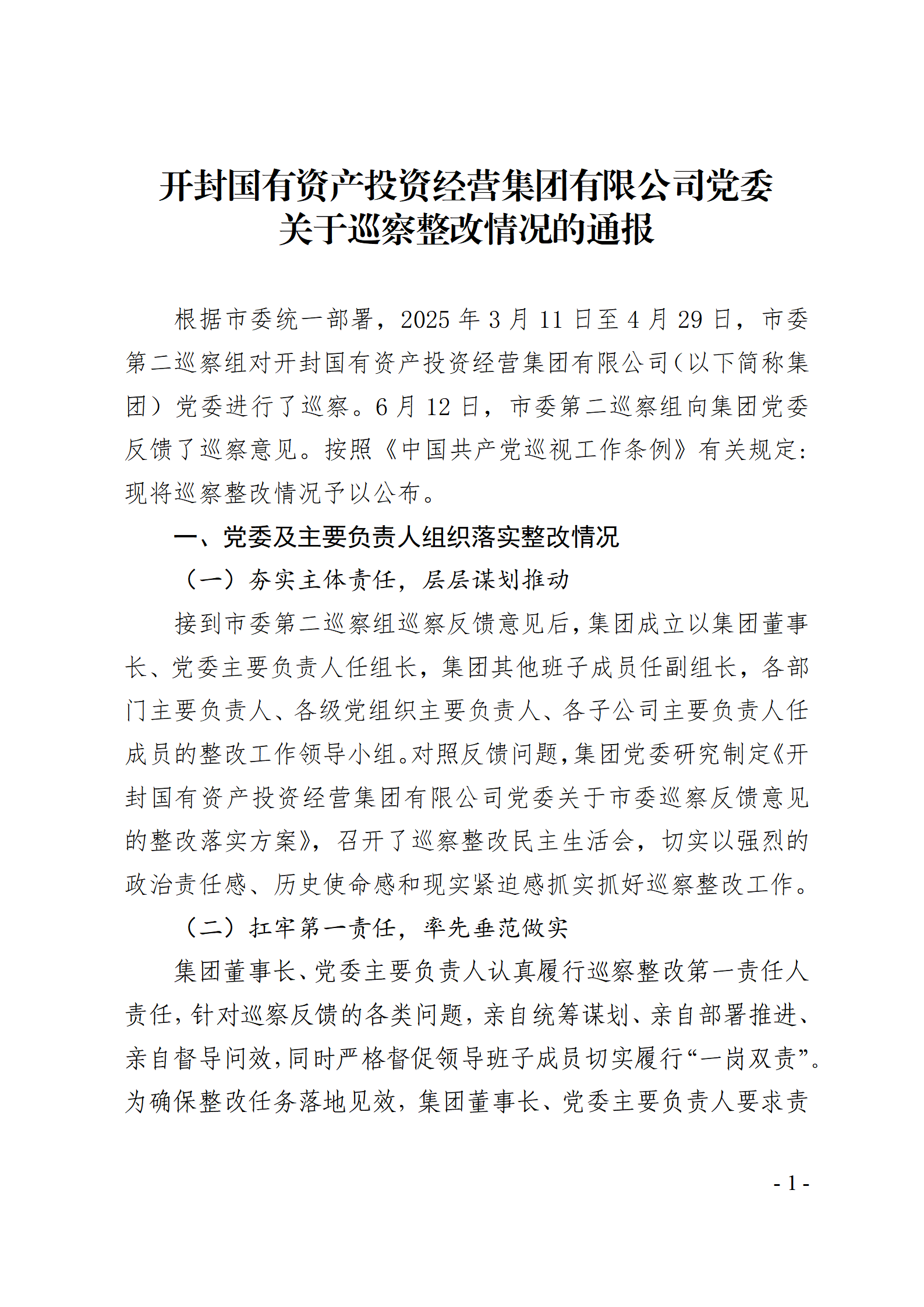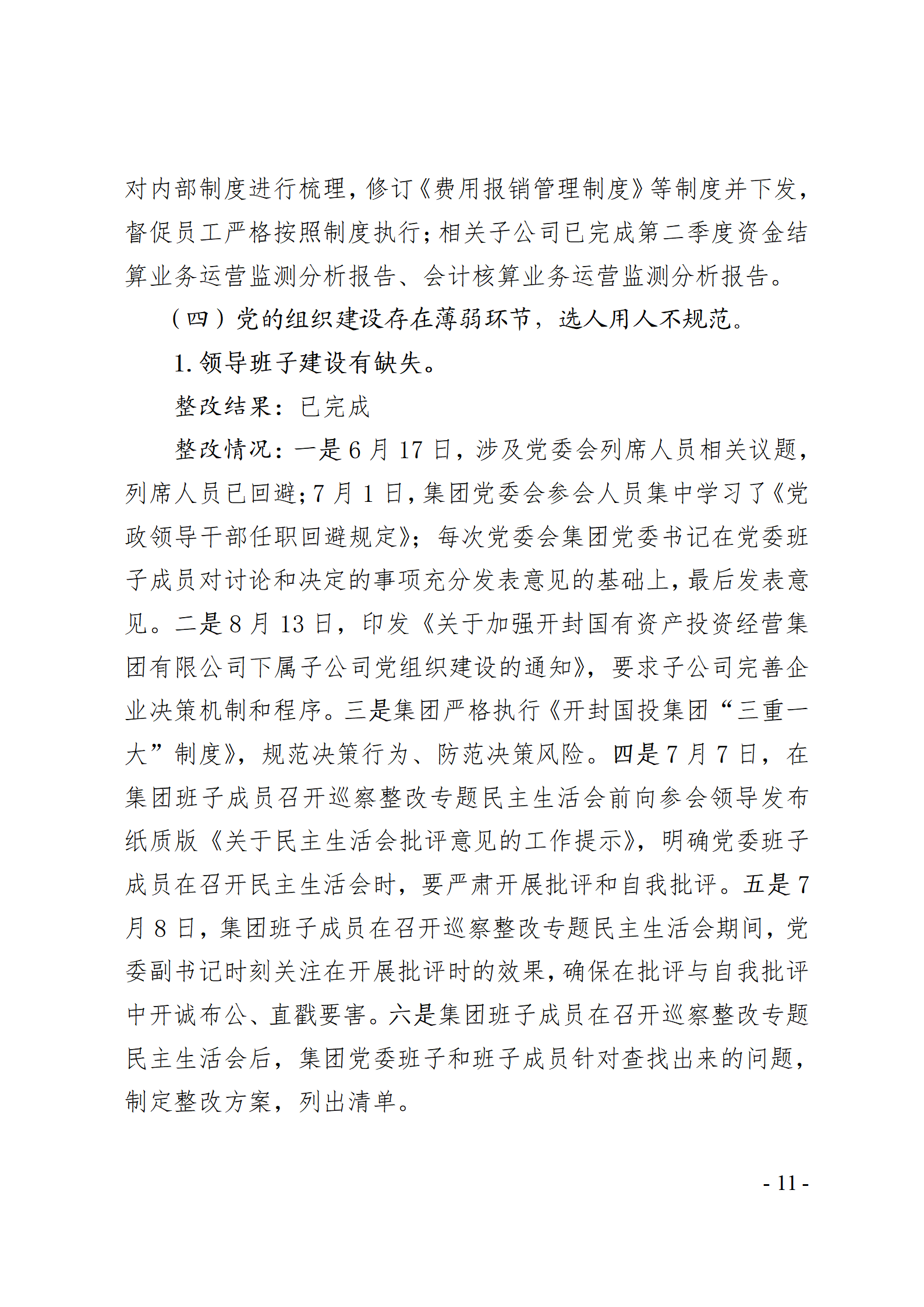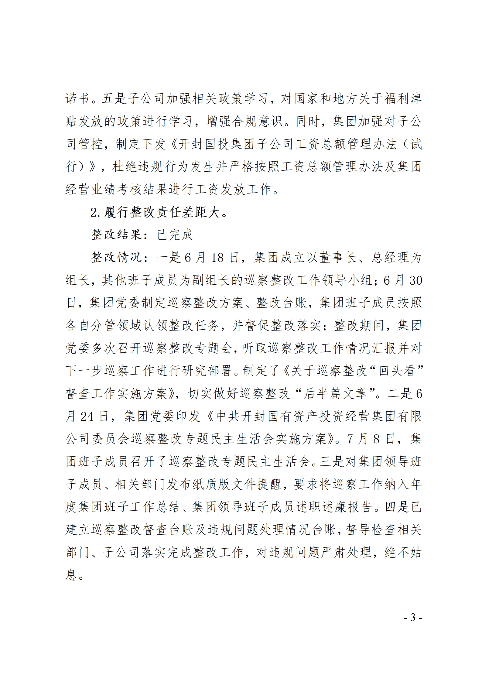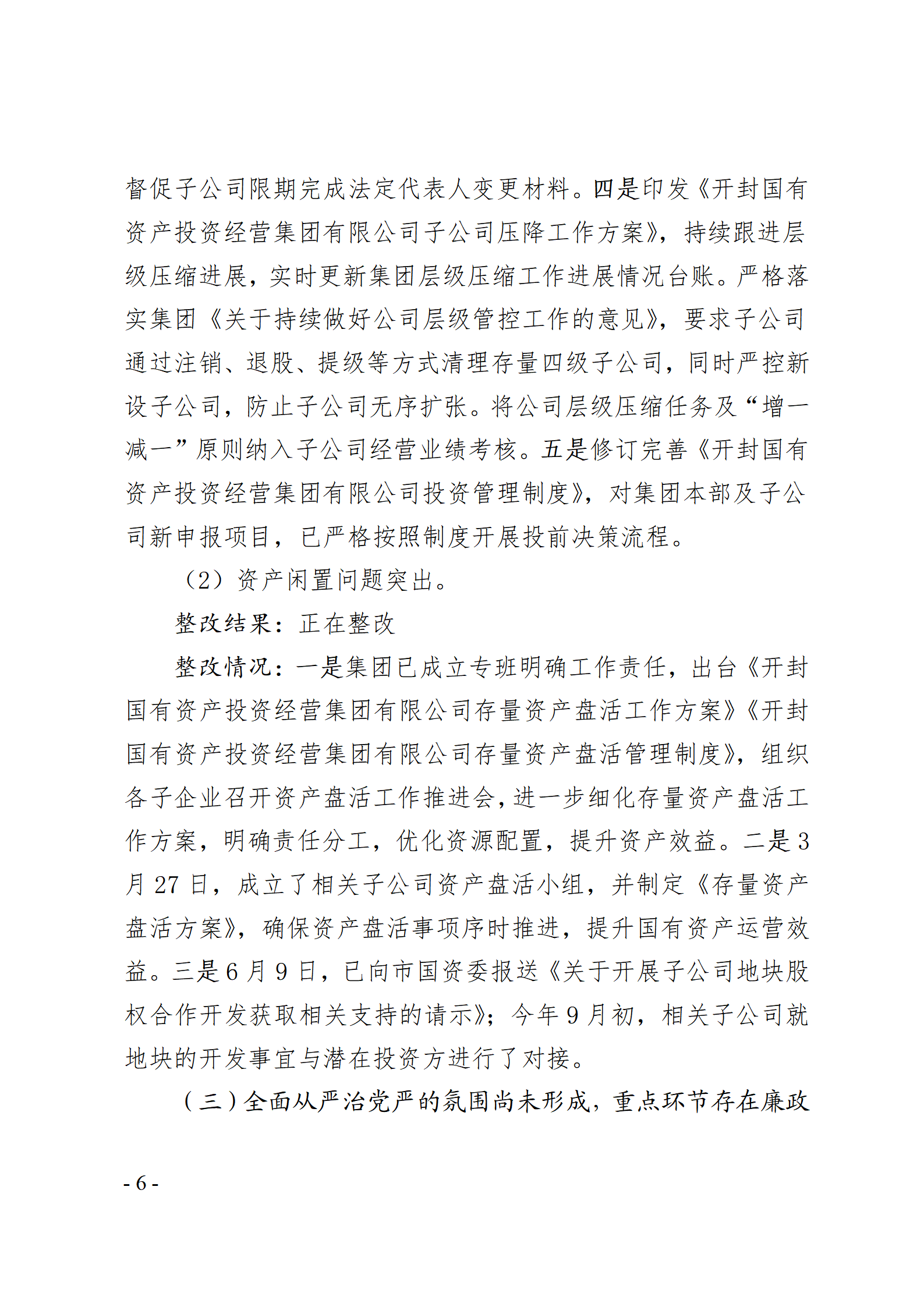 開封國有資產投資經營集團有限公司黨委關于巡察整改情況的通報